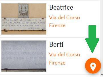 L’app contiene due mappe principali: la prima è quella delle “lapidi dantesche”, la seconda è quella di tutti gli altri luoghi. Per accedere alla prima, selezionare l’indicatore arancione di forma circolare in basso a destra del menù (vedi immagine sotto).