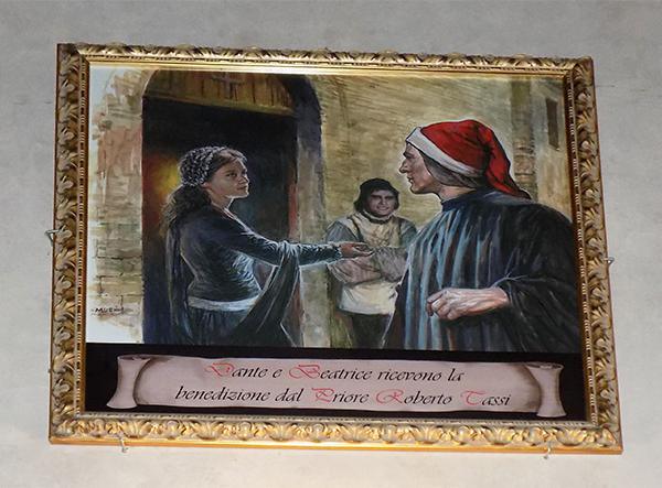 Ciò che la rende così interessante è la didascalia: “Dante e Beatrice ricevono la benedizione del priore Roberto Tassi”. Se si pensa che la terza figura nel dipinto, quella che assomiglia a Franco Citti, sia Roberto Tassi, non è vero.