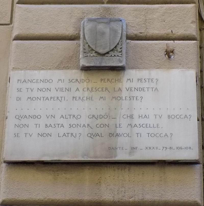 The words on the plaque come to us from the unforgettable scene of the ninth and lowest circle of Hell, the one where Dante inadvertently (or intentionally?) kicks the head of a sinner trapped in ice, together with others who are punished there for having betrayed their homeland. The first three verses contain the complaint of Bocca degli Abati whom Dante has kicked. The second three contain the response of Buoso da Dovera who, not surprisingly, betrays his fellow infernal inmate by revealing Bocca’s name.