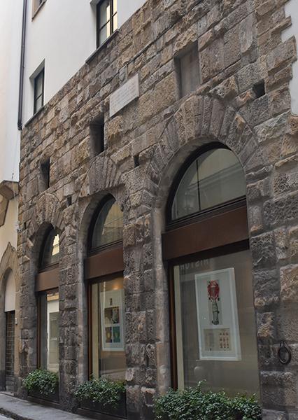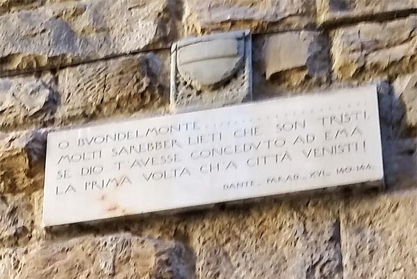 Once again, this plaque commemorates a passage from Dante’s conversation with Cacciaguida in Paradiso. Dante’s great-great-grandfather is complaining about the newcomers to Florence, just as he did on the plaque that went missing from farther down the street (Baldovinetti). In the early 1100s, this area of Florence, known as Borgo Santi Apostoli, contained about six city blocks of properties between the Roman walls (now via Porta Rossa) on one side and the Arno on the other.