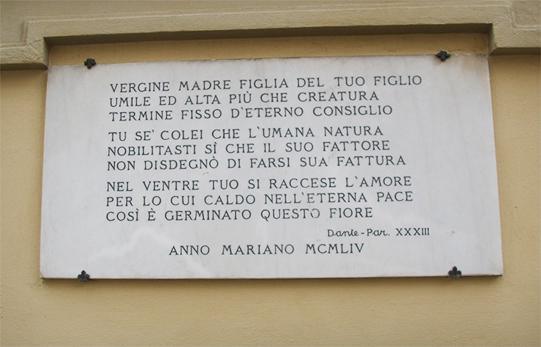 For the celebrations held in honor of Dante’s six hundredth birthday (in 1865), several plaques were put up along the parade route that started in Piazza Santo Spirito and ended at the inauguration of the Dante statue in Piazza Santa Croce. The Misericordia confraternity placed one nearby that said: