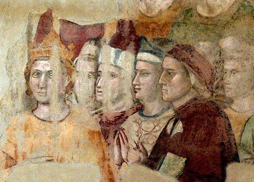 I lettori di Dante riconosceranno facilmente la sua immagine. Vasari afferma che anche Guido Cavalcanti e Brunetto Latini sono immortalati in questo dipinto, ma la maggior parte degli studiosi non è d’accordo. Altri pensano che Dante sia affiancato da Brunetto e Corso Donati.