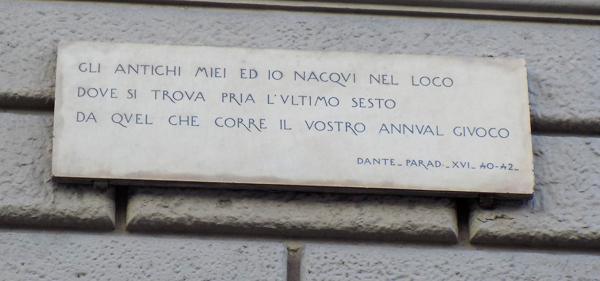 In questi versi è ancora Cacciaguida che parla. L’importanza di questa lapide sta nel fatto che nomina gli antenati di Dante, gli Elisei. Nacquero a Firenze nell’ultimo sestiere, ossia l’ultimo quartiere dei due collegati dal palio della città (una corsa di cavalli non diversa da quella che ancora si corre a Siena e che aveva luogo ogni anno nel giorno di San Giovanni Battista).