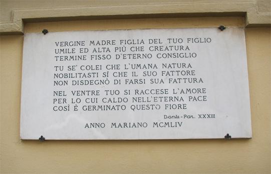 Come anche per San Salvi, questa lapide non è una tra quelle che i fiorentini cominciarono a collocare nel 1903. Infatti si tratta di un’iscrizione più moderna ma non necessariamente meno importante. Questi versi tanto solenni quanto paradossali aprono il canto finale della Divina Commedia con l’inno di San Bernardo a Maria. La descrizione della infinitamente caritatevole Vergine è una scelta perfetta per il muro della sede della Arciconfraternita della Misericordia di Firenze, un’organizzazione di laici fondata nel 1244 da San Pietro da Verona. Al di là della Misericordia, tuttavia, le principali attività di San Pietro Martire a Firenze erano dirette a identificare e a punire gli eretici. Spinti all’azione, alcuni Catari a Milano assunsero un sicario di nome Carino da Balsamo per eliminare l’inquisitore nel 1252. Siamo certi di questo fatto proprio perché, più tardi, lo stesso sicario si convertì e passò gli ultimi quattro decenni della sua vita a fare penitenza in un monastero di Forlì prima di morire nel 1293.