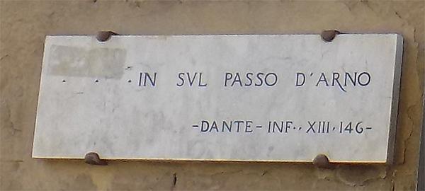 Questa lapide si trova nella Loggetta sotto il Corridoio Vasariano, al centro di Ponte Vecchio. Sebbene Dante parli diverse volte dell’Arno, ad esso si riferisce in maniera specifica solamente in due casi: il primo, nella selva dei suicidi (Inferno XIII) e il secondo, nel discorso di Cacciaguida (Paradiso XVI.146). In entrambe le istanze Dante intende la statua di Marte che si spiega con il riferimento alla lapide posta alla estremità del ponte.