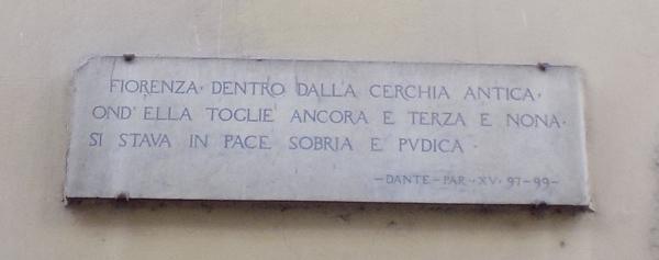 I versi in questa lapide vengono pronunciati da Cacciaguida nel suo lungo discorso sull’antica gloria di Firenze. La prima cinta muraria venne edificata (come ricordato anche dallo storico Giovanni Villani) nell’anno 1078 e una piccola parte di essa è oggi visibile tra Piazza San Firenze e via del Proconsolo. “Terza” e “Nona” si riferiscono alle ore in cui il campanile della Badia suonava per indicare l’inizio e la fine della giornata lavorativa (dalle nove del mattino alle tre del pomeriggio). Oggi le campane suonano 30 e 15 minuti prima della celebrazione della messa.