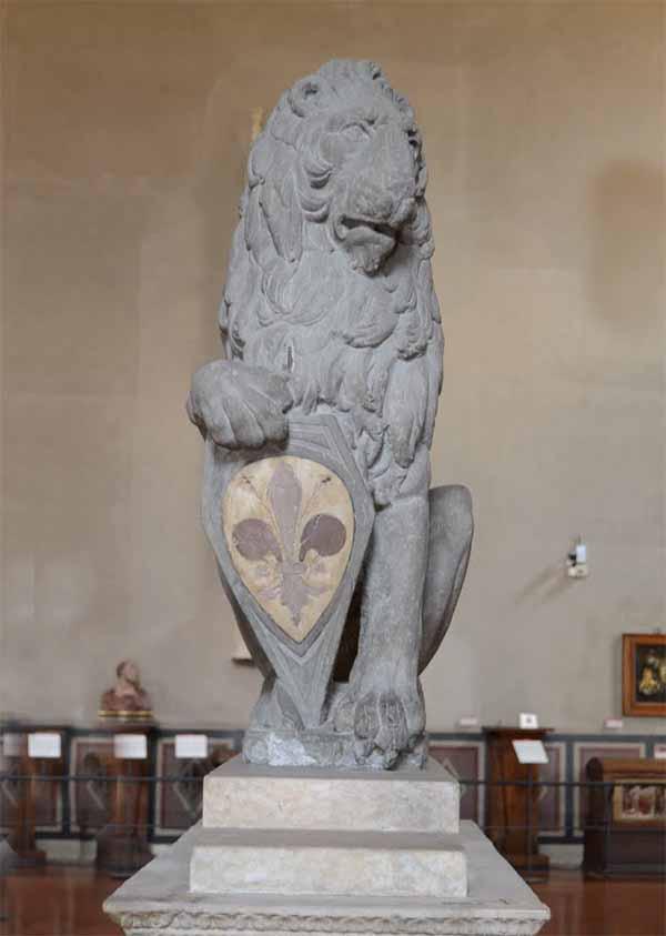 Florence’s citizens were especially proud of them, a fact that goes back even further that the invention of the Marzocco (the Lion on the other side of the building that holds a shield bearing a red lily: Donatello’s version, below, is in the Bargello). They publicly celebrated the animals’ births and mourned their deaths. The last lion to be kept as a sort of city mascot died in 1777.