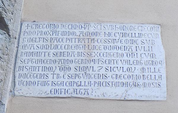 La lapide nella foto in alto rivela un messaggio importante (anche se in un latino piuttosto raro). Si legge: “Io [cioè, la chiesa personificata] fui fondata per amore di Cristo, da Papa Gregorio X in onore di Papa Gregorio I, nel giorno in cui i Guelfi fecero pace e terminarono le minacce Ghibelline: la splendida giornata di sole del 12 luglio dell’anno di nostro Signore 1273, alla presenza del Papa, così come dei capi bizantini e siciliani. Questa bella cappella di pace fu fondata nel 1273 da Gregorio X e la sua costruzione fu eseguita dalla famiglia Mozzi”.